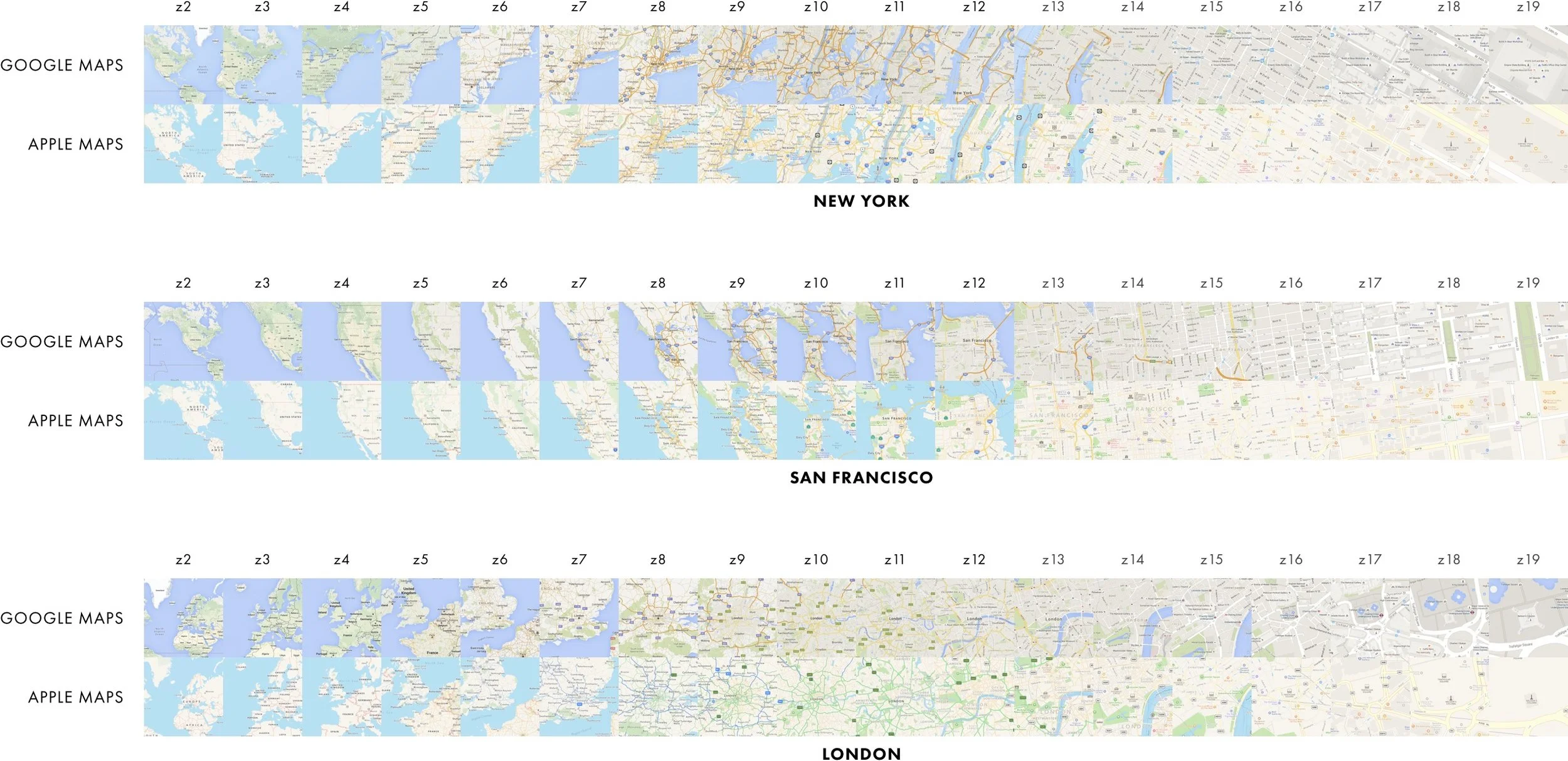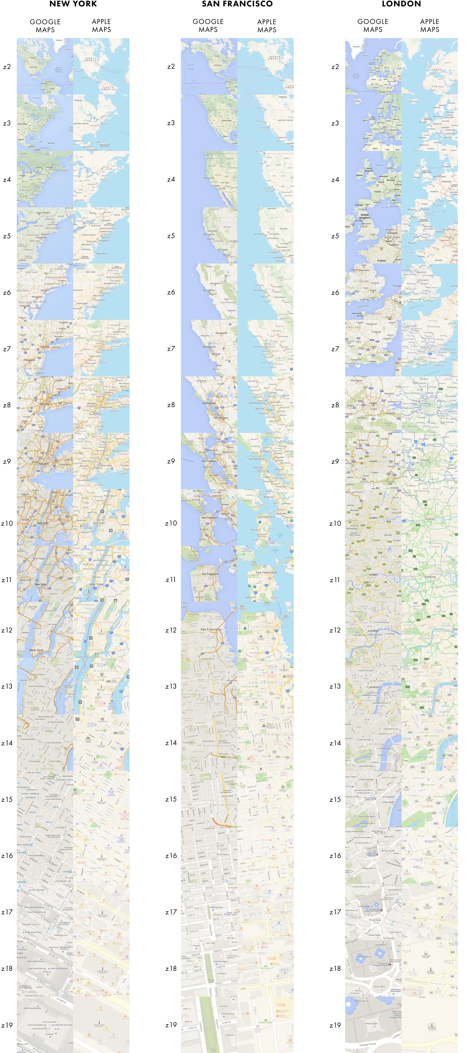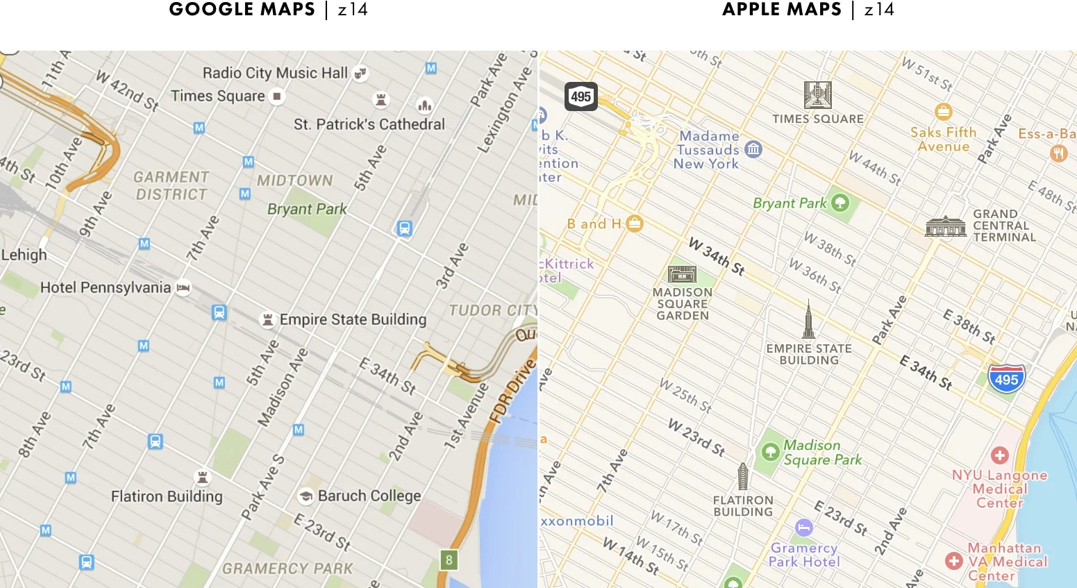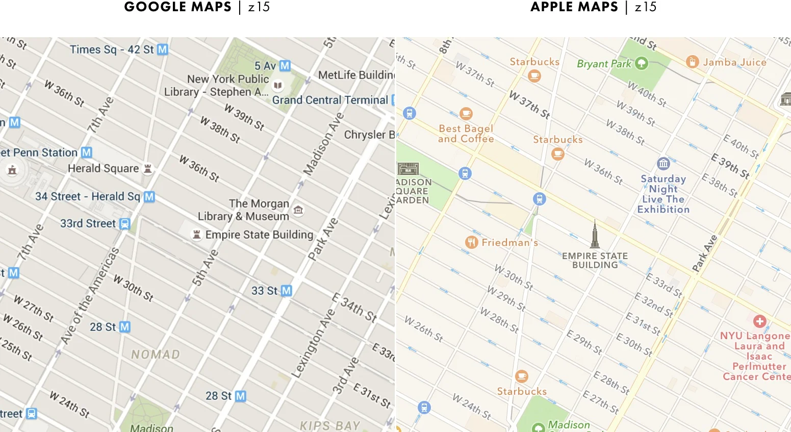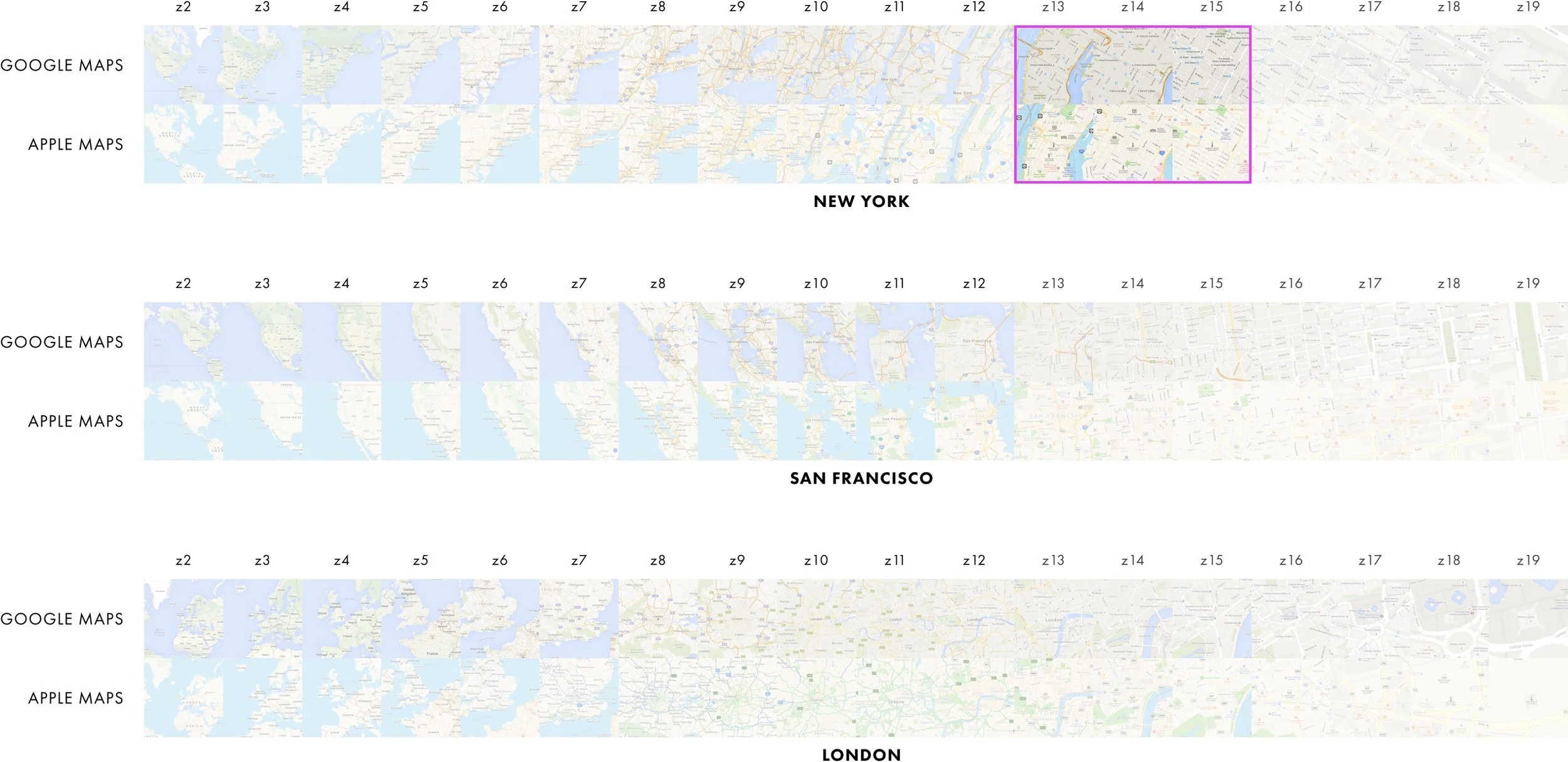 We’ll look at 54 pairs of maps of three different cities: New York, San Francisco, and London. Each pair shows an identical area, pixel for pixel, on Google Maps and Apple Maps at the exact same zoom: