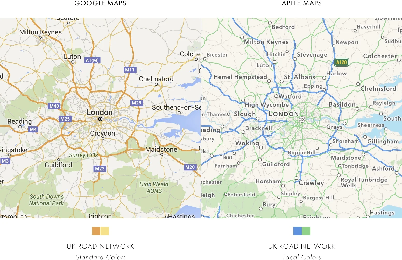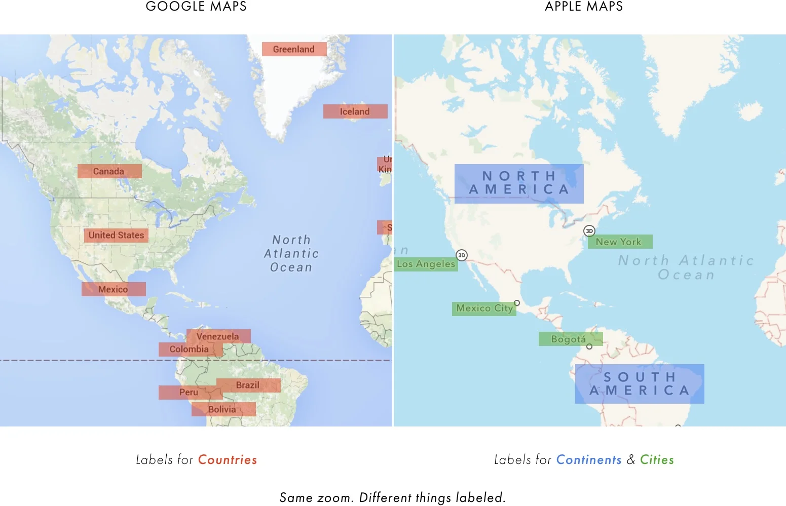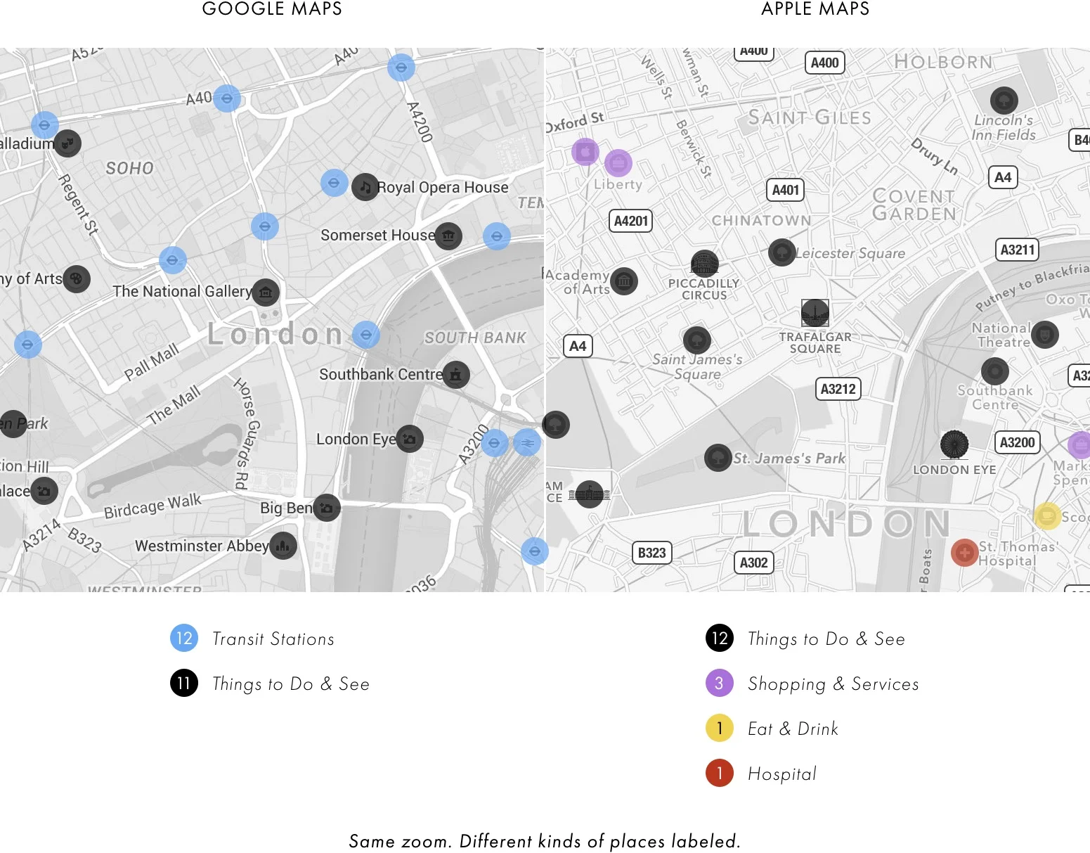 As you can see, Google and Apple Maps show surprisingly different (and often opposite) views of the world. But what makes these differences even more interesting is how ubiquitous both maps have become…