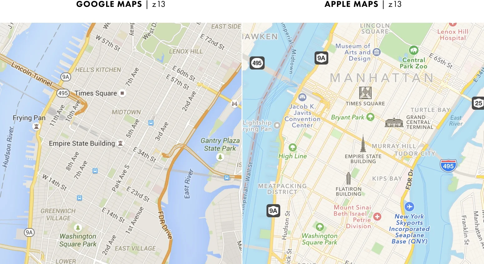 At its heart, this essay compares the current state of Google’s and Apple’s cartography. But it’s also something more: an exploration into all of the tradeoffs that go into designing and making maps like these.